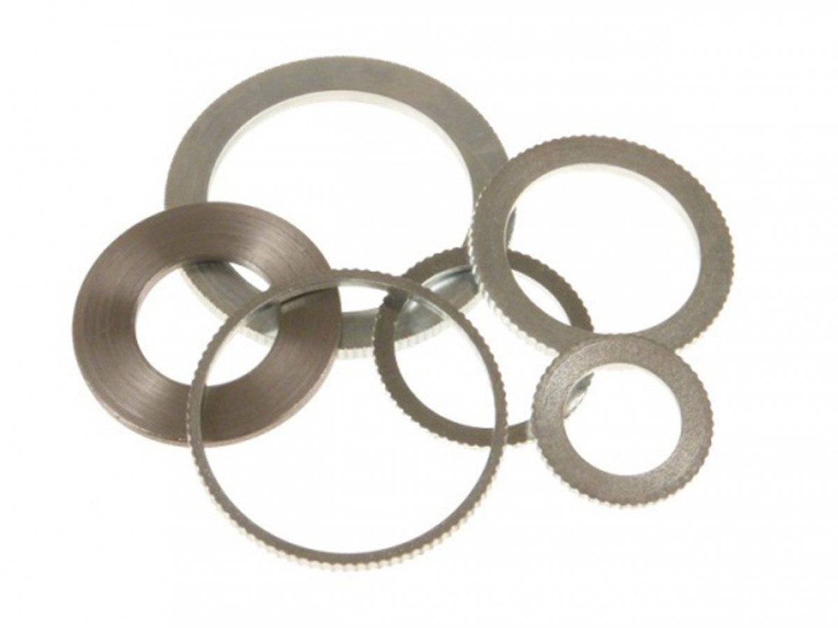 Redukčný krúžok pre pílové kotúče slúžia pre zmenšenie (redukciu) upínacieho otvoru pílových kotúčov. Je označený trojčíslím, kde prvý udáva vonkajší priemer telesa, druhé číslo udáva veľkosť (silu) upínacieho telesa a tretie hrúbku krúžku (upínací otvor).